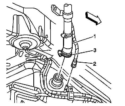 9. Disconnect the fuel EVAP hose (2) from the chassis bundle. Refer to Plastic Collar Quick Connect Fitting Service (Plastic Collar Quick Connect Fitting Service).