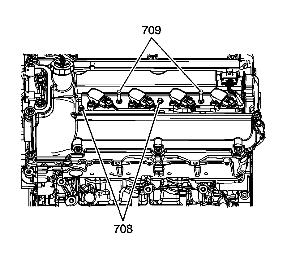4. Install the left ignition coil assembly bolts (708) and ball studs (709) to tighten to 10 Nm (89 lb in).