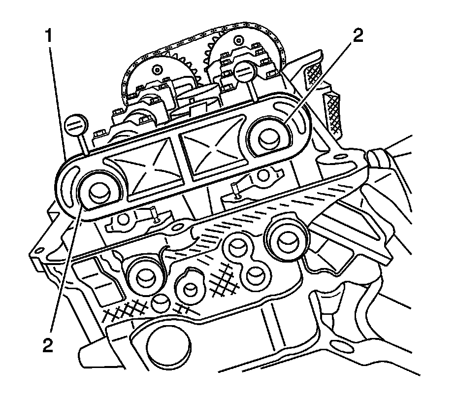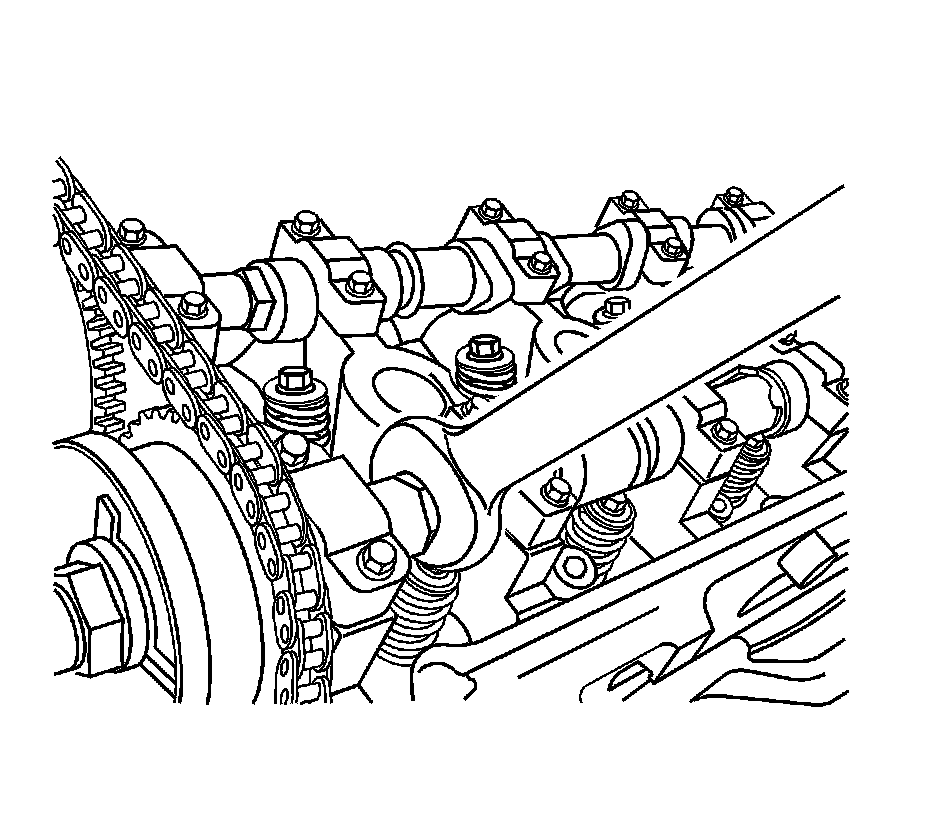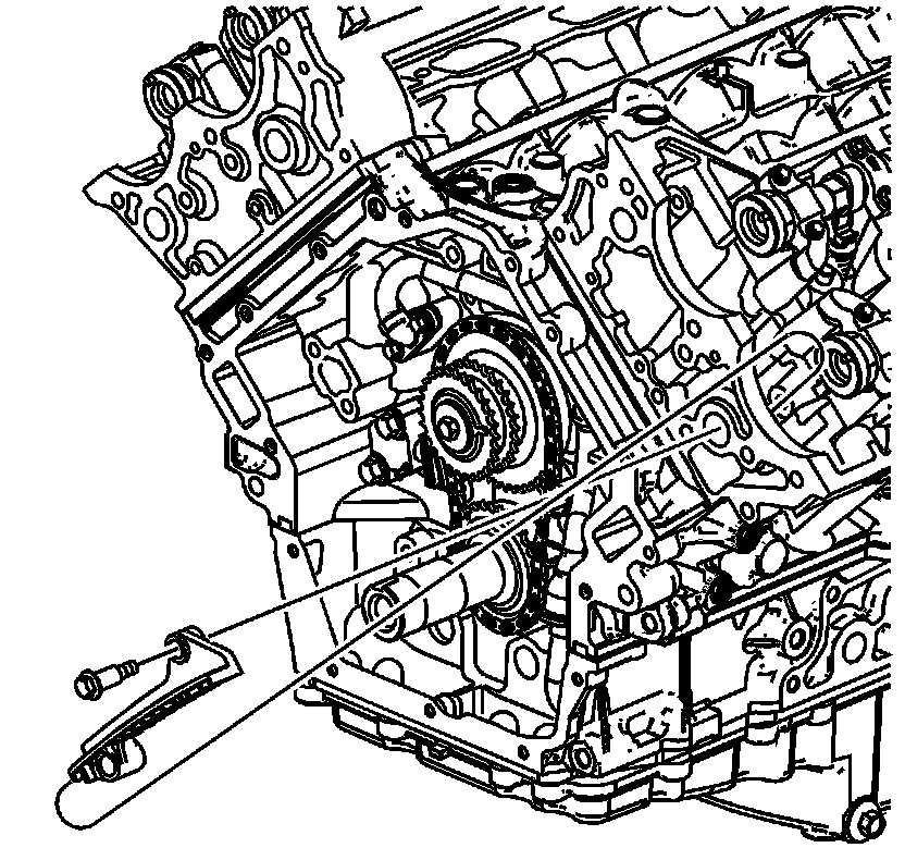 1. Remove the left secondary camshaft tensioner. Refer to Secondary Camshaft Intermediate Drive Chain Tensioner Replacement - Left Side (Secondary Camshaft Intermediate Drive Chain Tensioner Replacement - Left).