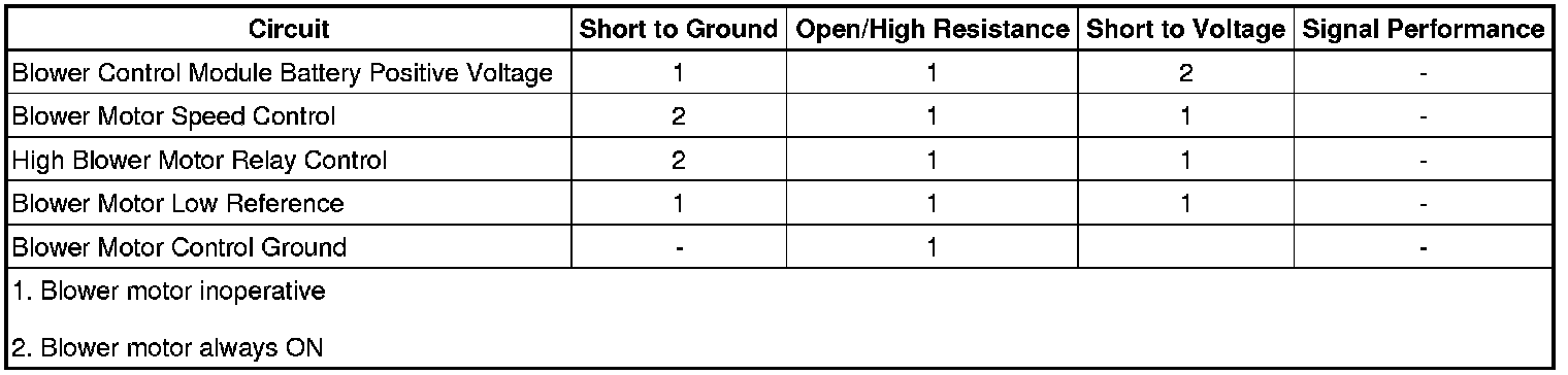 The blower control module is an interface between the HVAC control module and the blower motor. The blower motor speed control, battery positive and ground circuits enable the control module to operate. The HVAC control module provides a pulse width modulation (PWM) signal to the blower controller in order to command the blower motor speed. The control processor uses the blower motor ground or low reference as a low side control to adjust the blower motor speed.