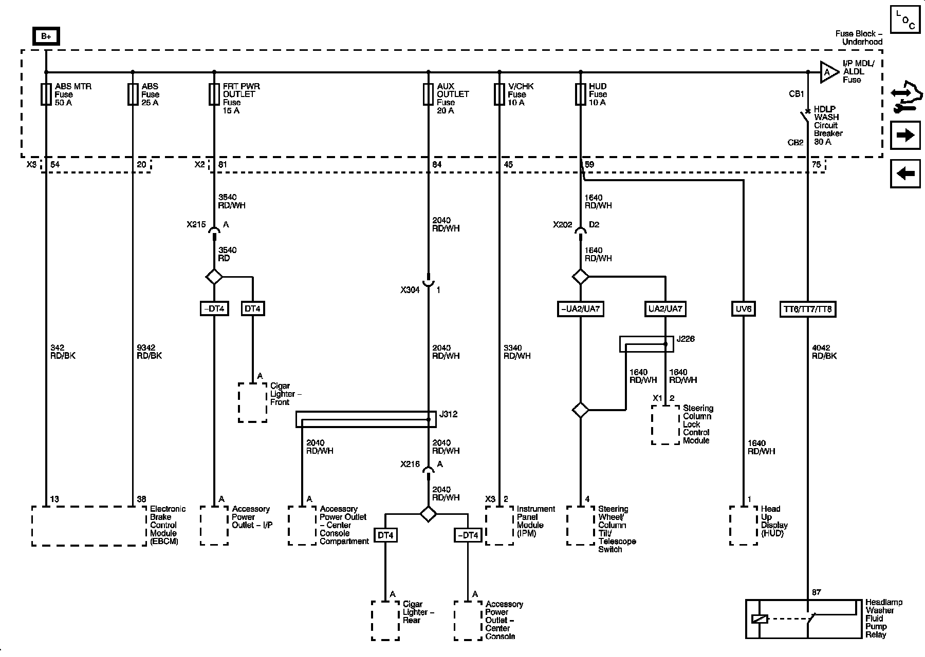 ABS, ABS MTR, AUX OUTLET, FRT PWR OUTLET, HUD, and V/CHK Fuses, HDLP WASH Circuit Breaker