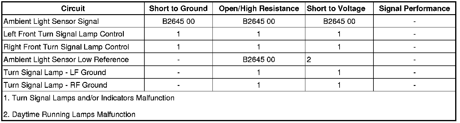 The ambient light sensor is used to monitor outside lighting conditions. The ambient light sensor provides a voltage signal that will vary between 0.2 and 4.9 volts depending on outside lighting conditions. The HVAC control module determines the ambient light conditions, DAY or NIGHT, based on the voltage from the ambient light sensor. The HVAC control module provides a low reference ground and 5-volt reference signal to the ambient light sensor. The ambient light sensor signal circuit is a direct input to the HVAC control module. The HVAC control module sends a message via serial data to the instrument panel module (IPM) indicating the outside light conditions based on the signal from the ambient light sensor. The IPM determines if outside lighting conditions are correct for either daytime running lights (DRL) or automatic lamp control (ALC) when the headlamp switch is in the AUTO position. In daylight conditions the IPM will command the DRLs ON. During low light conditions the IPM will command the low beam headlamps ON. Any function or condition that turns on the headlamps will cancel DRL operation. With the turn signal/multifunction switch in the OFF position, the DRLs which consists of the front turn signal lamps will either be turned ON or OFF after a 30-second delay, depending on whether daylight or low light conditions are sensed by the ambient light sensor.
