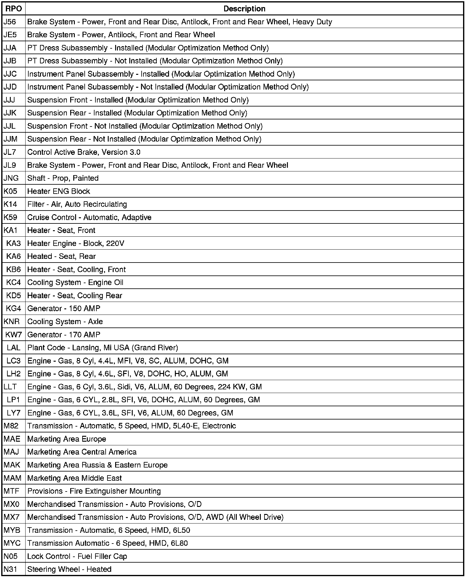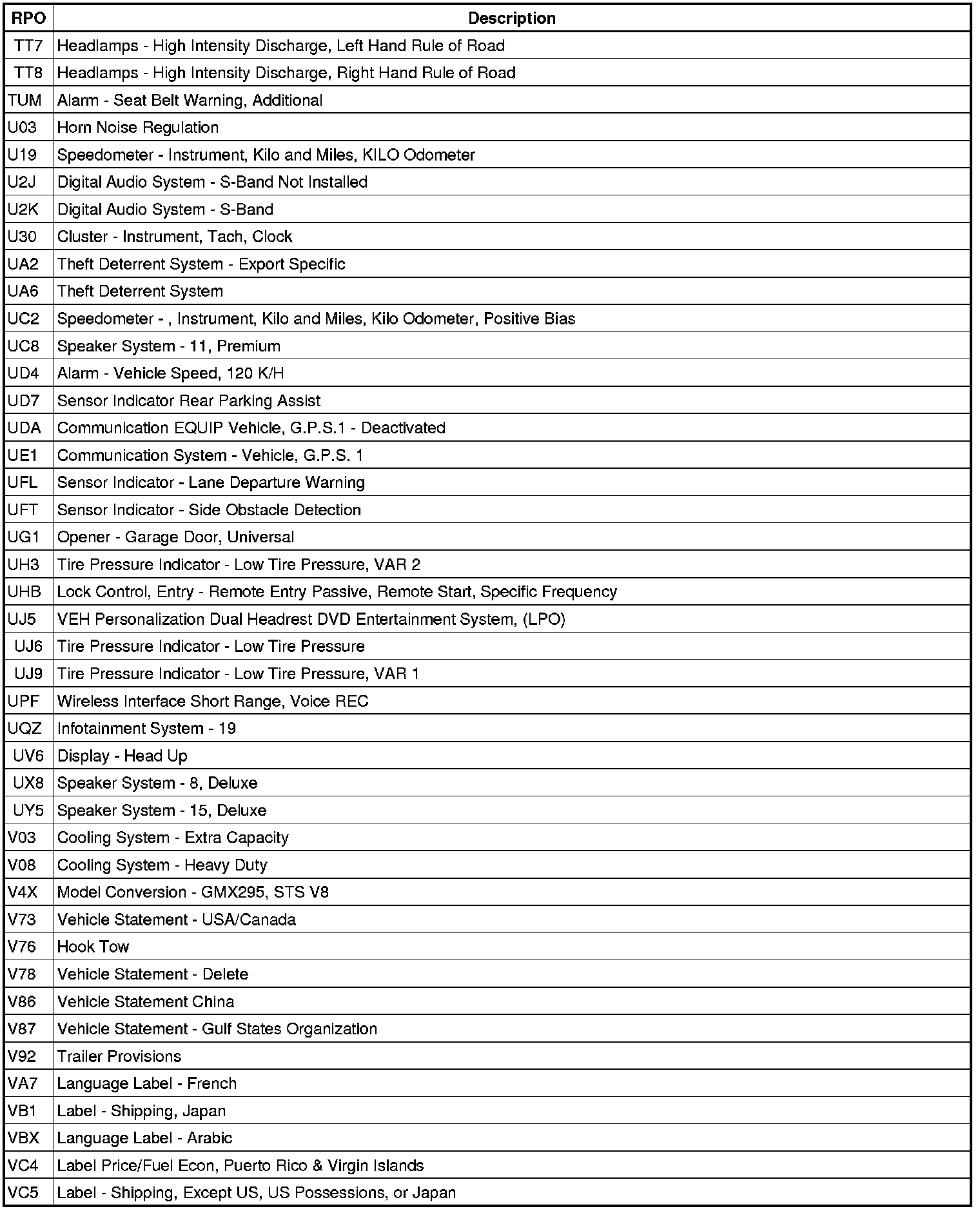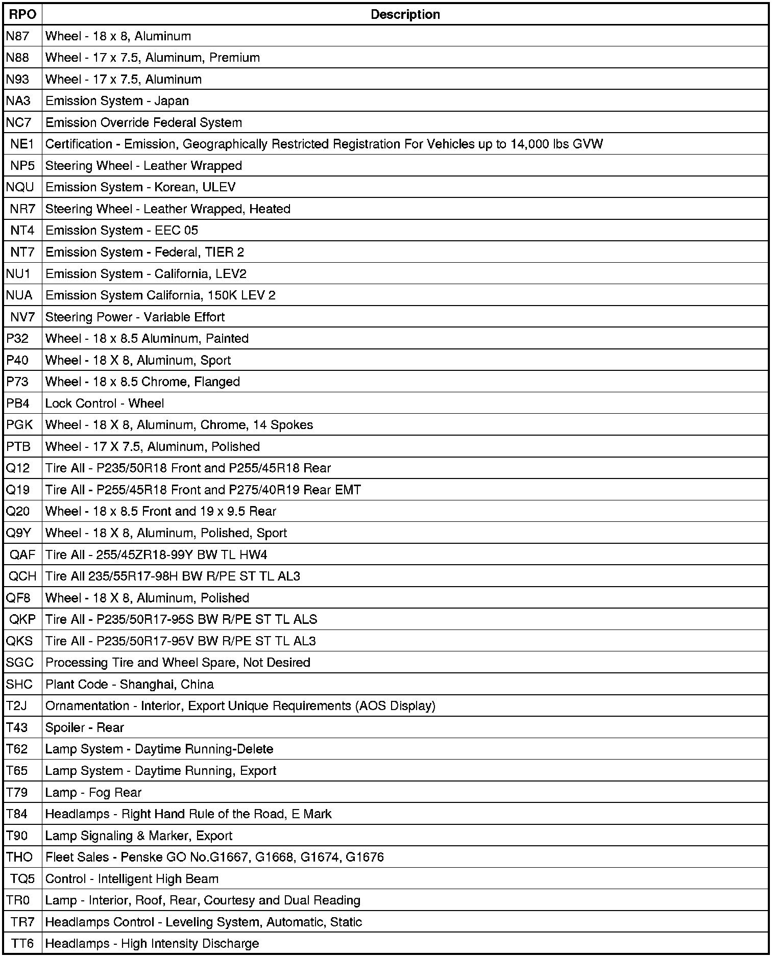 The following table provides the description of the Regular Production Option (RPO) codes that are available on the vehicle. The vehicle's RPO list is printed on the Service Parts Identification Label.