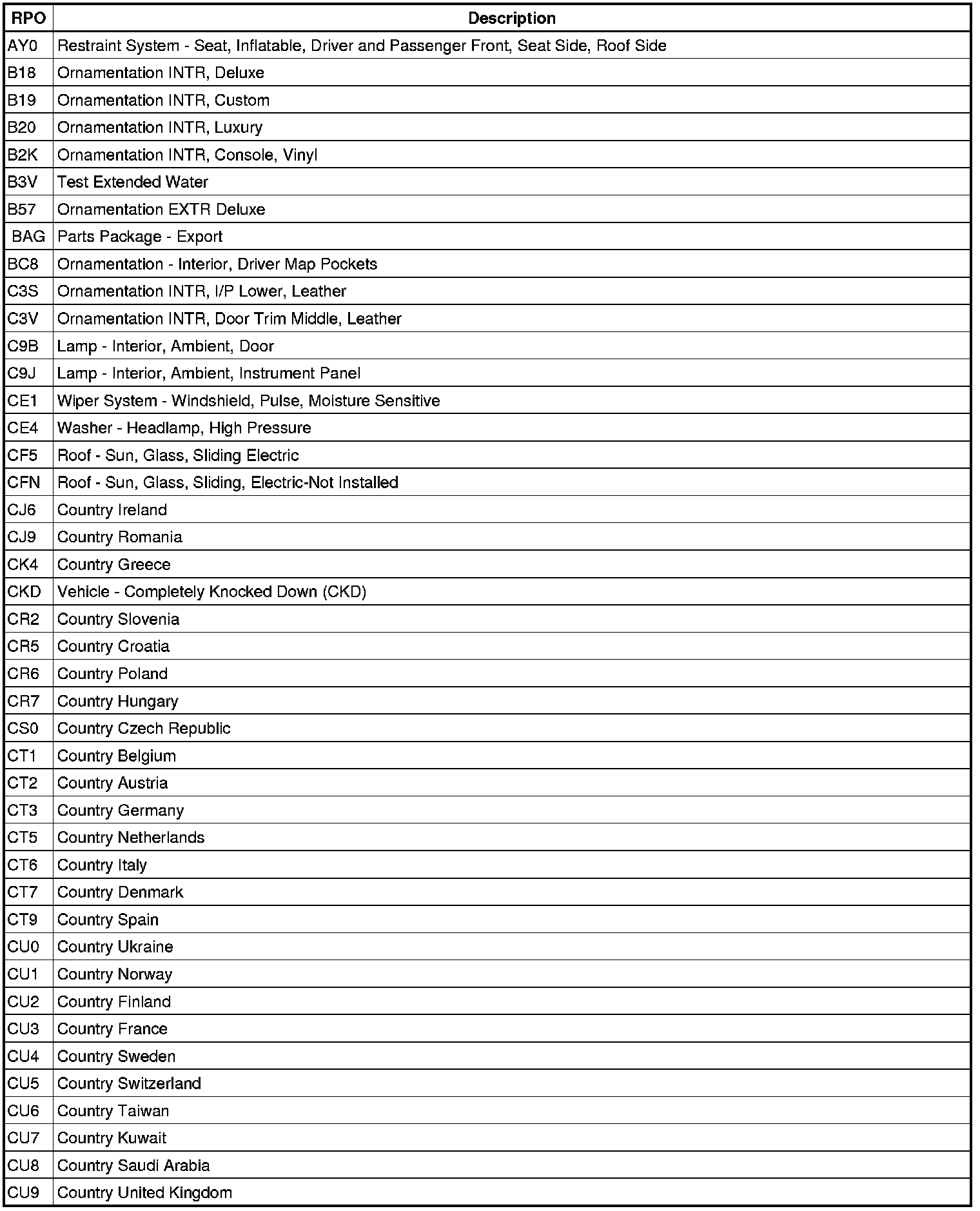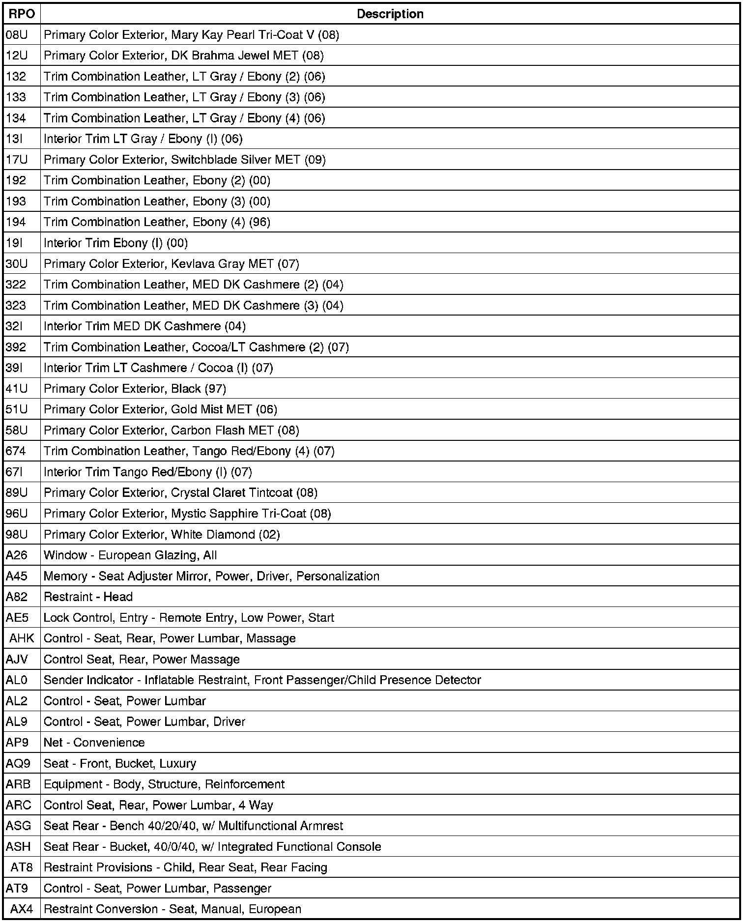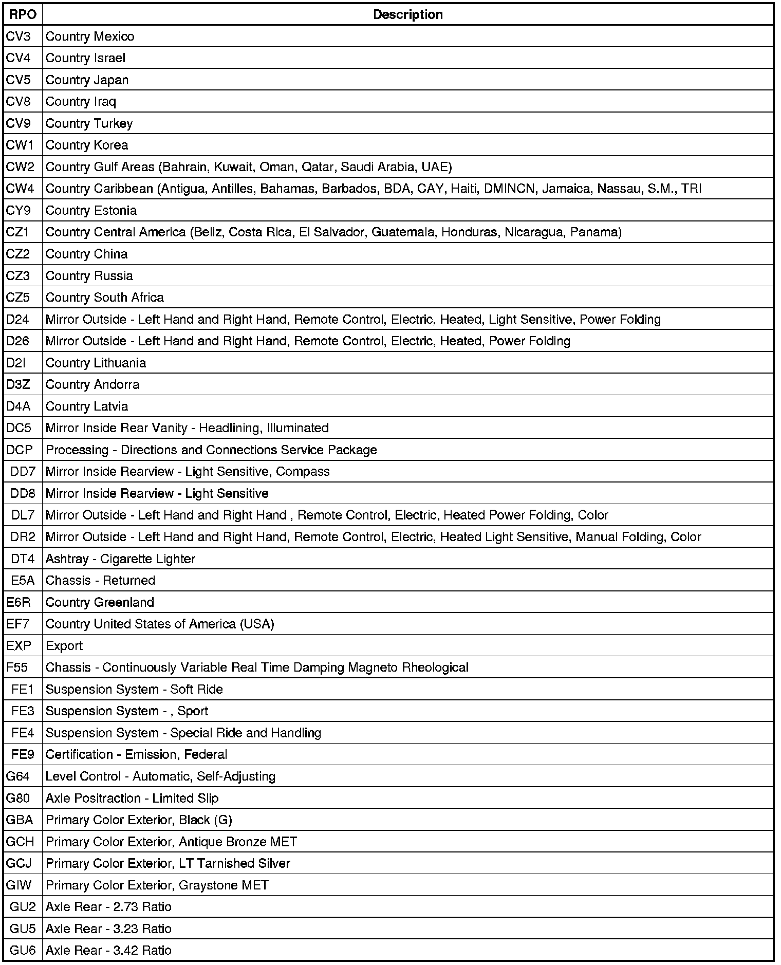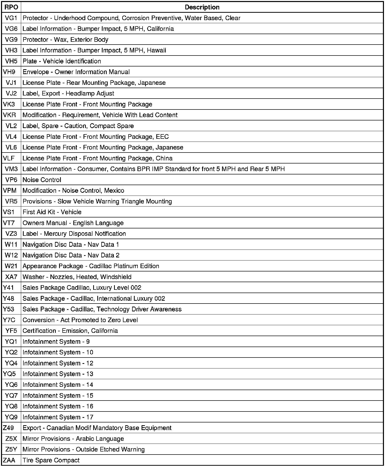 The following table provides the description of the Regular Production Option (RPO) codes that are available on the vehicle. The vehicle's RPO list is printed on the Service Parts Identification Label.