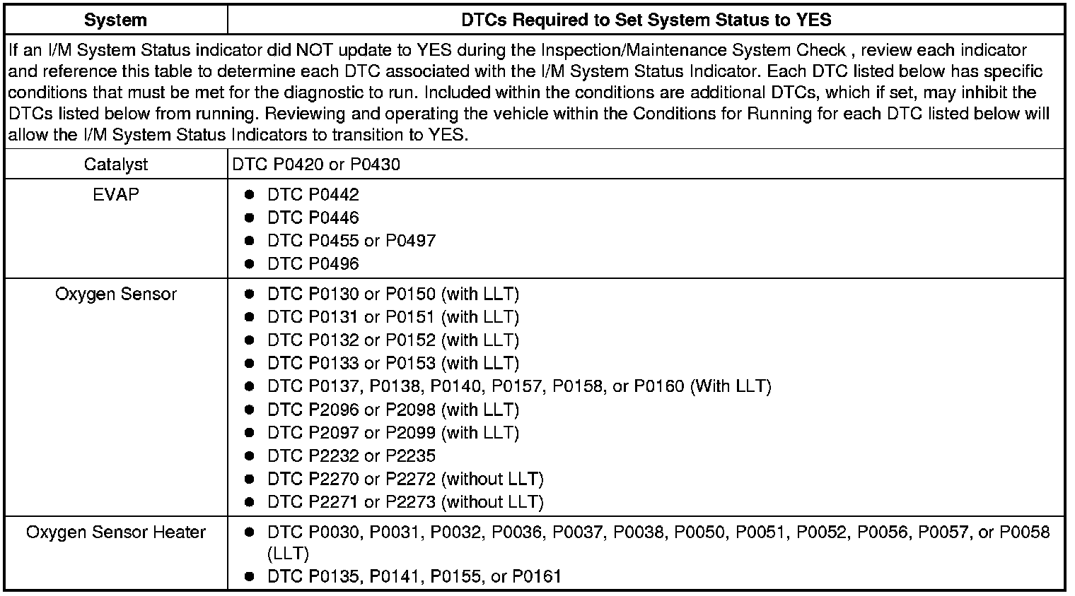 Inspection/Maintenance System DTC Table
