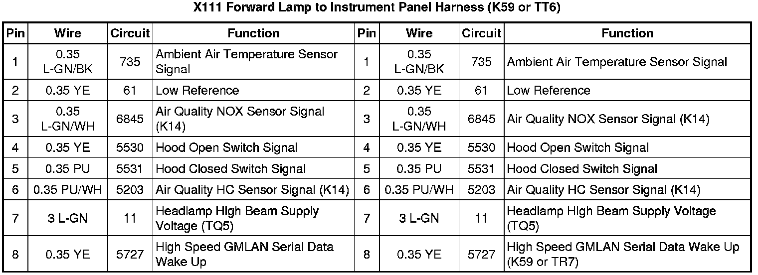 X111 Forward Lamp to Instrument Panel Harness (K59 or TT6)