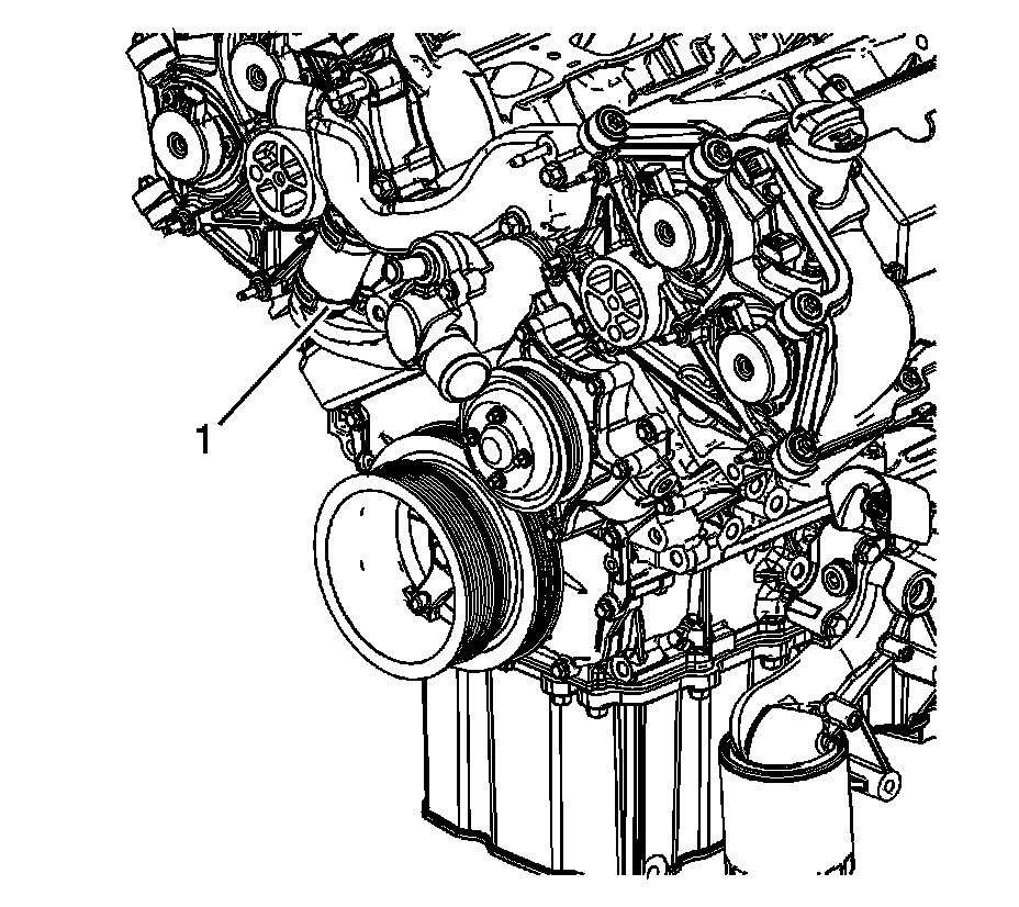 3. Reposition the clamp (1) on the bypass hose. Ensure the clamp release mechanism of the clamps are oriented towards the engine front cover and away from the drive belt path.