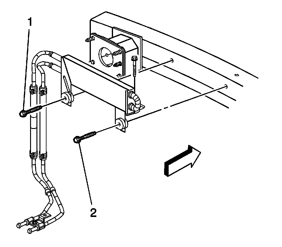 3. Install the power steering cooler bolts (1, 2) to the power steering cooler brackets and tighten to 9 Nm (80 lb in).