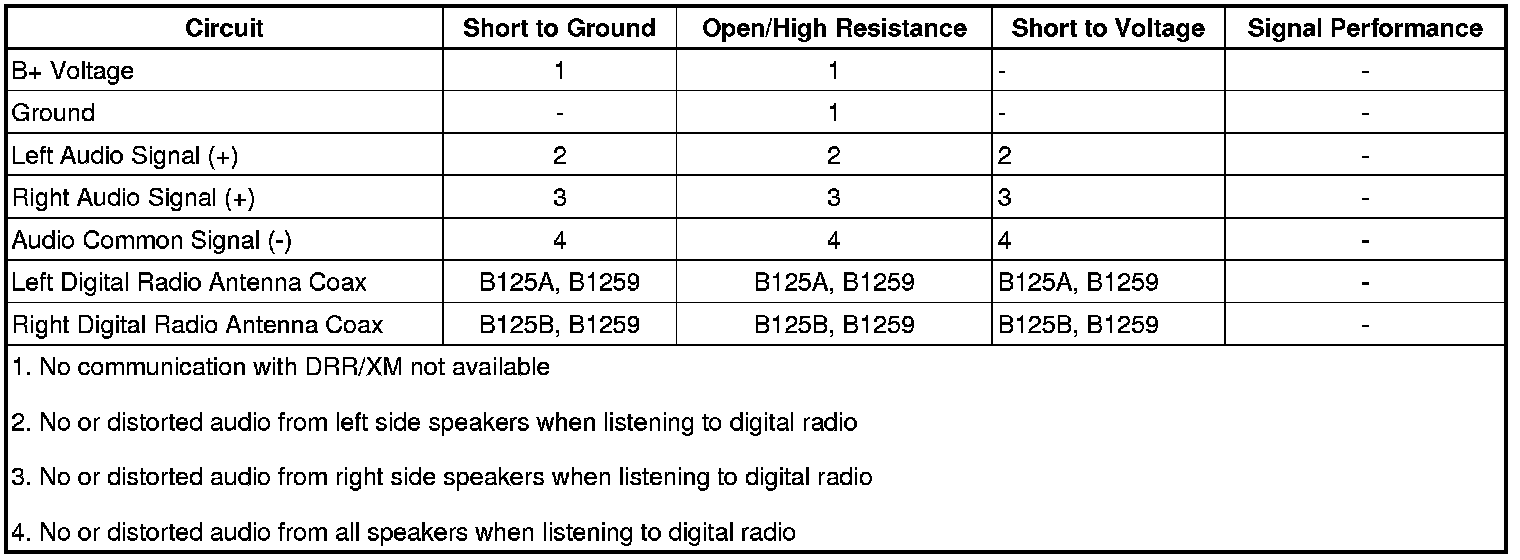 The digital radio receiver (DRR) receives XM satellite radio signals via 2 digital radio antennas located in each of the outside rearview mirrors. The antenna circuits are coaxial cables that carry the digital radio signal information received by the antennas to the DRR. The antenna coax also provides a path for voltage to power the antennas. Separate left and right audio signals (+) are sent from the DRR to the CD changer. The CD changer processes these signals and passes them to the audio amplifier.