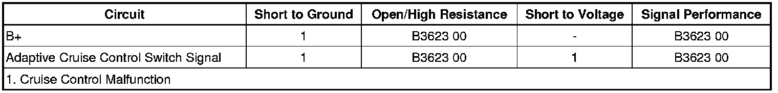 The body control module (BCM) monitors the adaptive cruise control (ACC) gap adjustment switch signal circuit to determine the driver selected headway. The gap switch is a momentary contact switch that connects a series of resistors. Each switch state, inactive, up and down, corresponds to a specific resistance value. The BCM determines the switch selection by the voltage drop across the resistor. The BCM sets DTC B3623 when it detects a stuck gap up/down switch.
