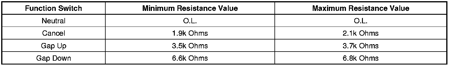 2. Cruise control switch ON, measure the resistance between terminal 1 and terminal 2 while individually activating and holding each ACC gap function switch and compare the resistance reading to the values in the table below.