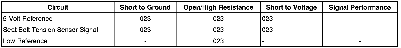 The inflatable restraint seat belt tension sensor is a 3-wire potentiometer mounted on the retractor or buckle side of the seat belt and provides an input to the passenger presence system (PPS). When an infant car seat is properly restrained on the front passenger seat, the seat belt is tightly secured through the car seat. The seat belt pulls on the tension sensor and changes the voltage signal to the PPS module. The PPS monitors the seat belt tension sensor circuit and if a fault is detected, DTC 023 will be set. When the PPS detects this DTC, it will notify the customer by illuminating either the ON or OFF indicator on the PASSENGER AIR BAG ON/OFF indicators. Then the PPS will communicate to the sensing and diagnostic module (SDM) through a non-class 2 communications circuit that a PPS fault is present. The SDM will then set DTC B0092 indicating a problem within the PPS and will suppress the deployment of the instrument panel (I/P) module and then request the instrument panel cluster (IPC) to illuminate the AIR BAG indicator.