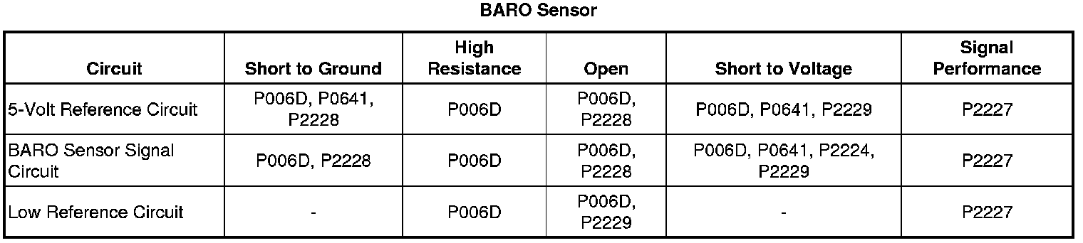 The barometric pressure (BARO) sensor measures the pressure of the atmosphere. This pressure is affected by altitude and weather conditions. A diaphragm within the BARO sensor is displaced by the pressure changes that occur from varying altitudes and weather conditions. The sensor translates this diaphragm action into the voltage signal input that is used by the engine control module (ECM) for diagnostics and emissions control.