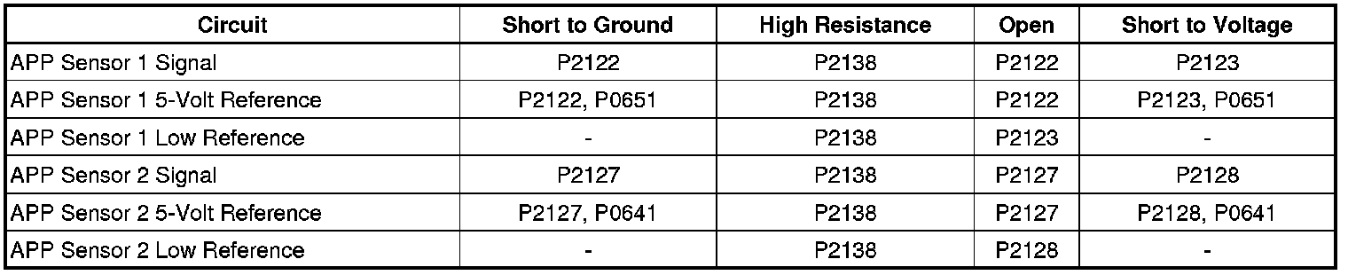 * DTCs P2120, P2122, P2123, P2125, P2127, P2128, and P2138 are Type A DTCs.
