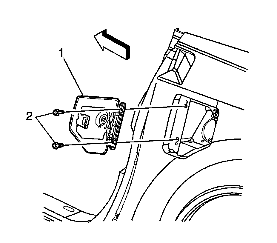 3. Remove the screws (2) mounting the fuel door (1) to the quarter panel.