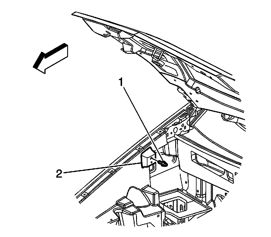 1. Install the lower hood assist rod ball stud (1) to the front structure (2) and tighten to 9 Nm (80 lb in).