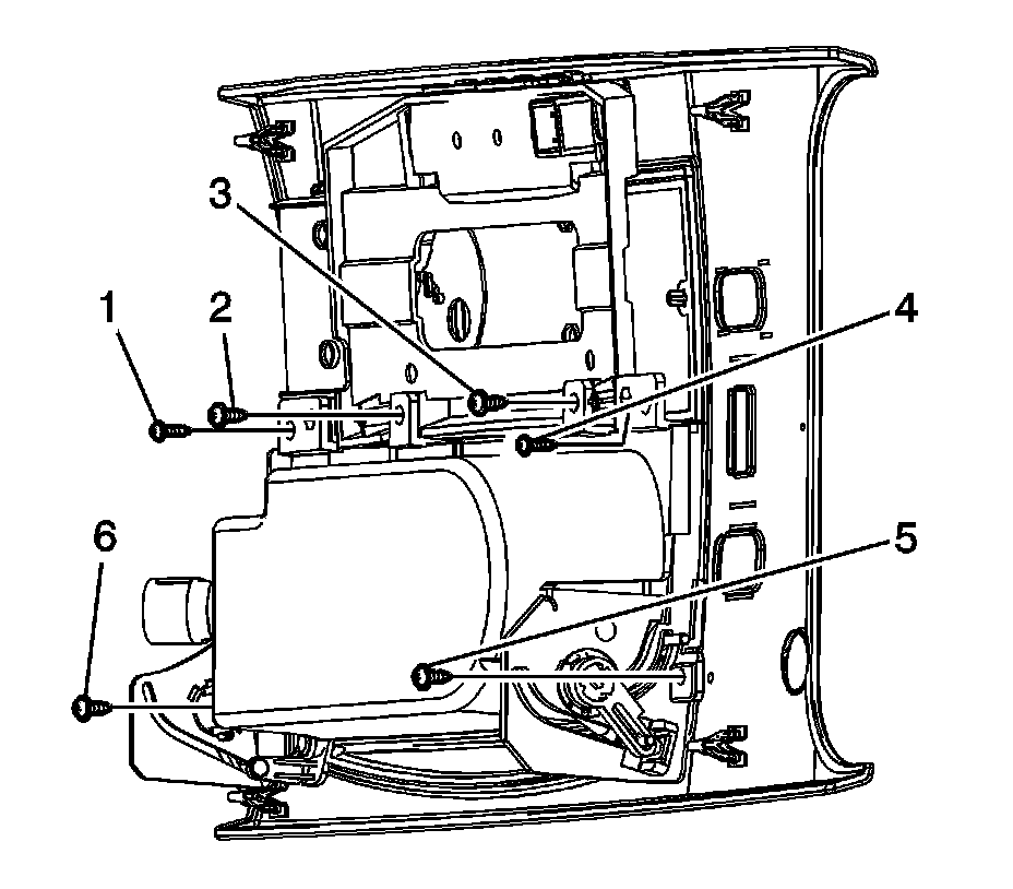 9. Install the screws (1-6) securing the console compartment to the console upper trim plate. Tighten the nuts to 2 Nm (18 lb in).