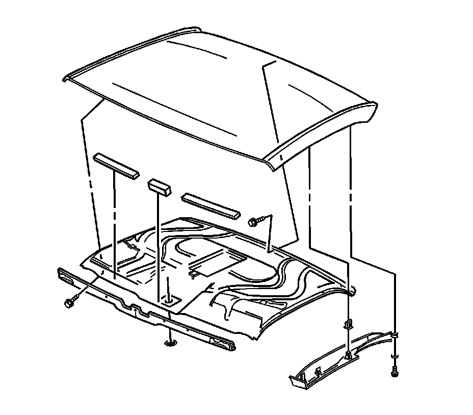 6. Install the trim panel retainer to the folding top headliner. Refer to Folding Top Headlining Trim Panel Retainer Replacement (Service and Repair).