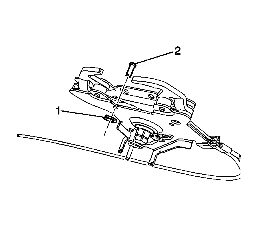 4. Install the pulley wheel pin (1) through the latch access hole (2) and the pulley wheel.