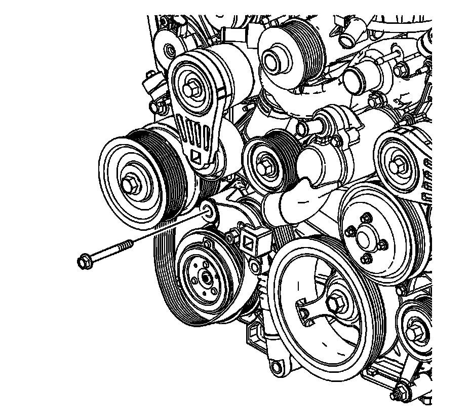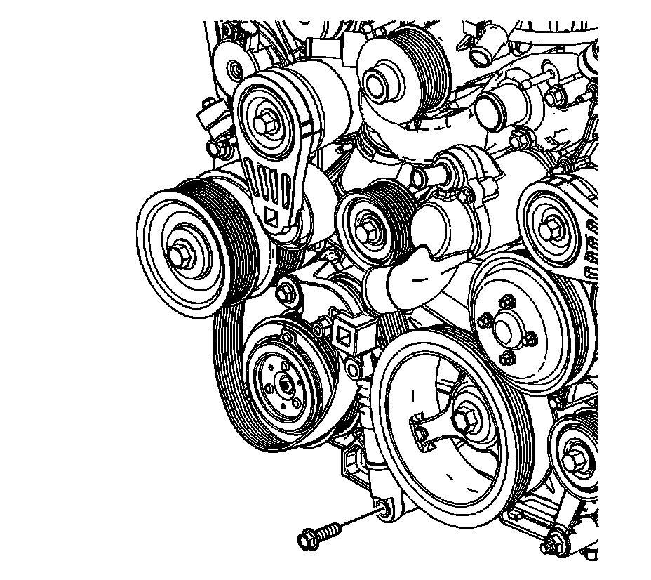 5. Loosely install the lower bolt into the A/C compressor and power steering pump drive belt tensioner.