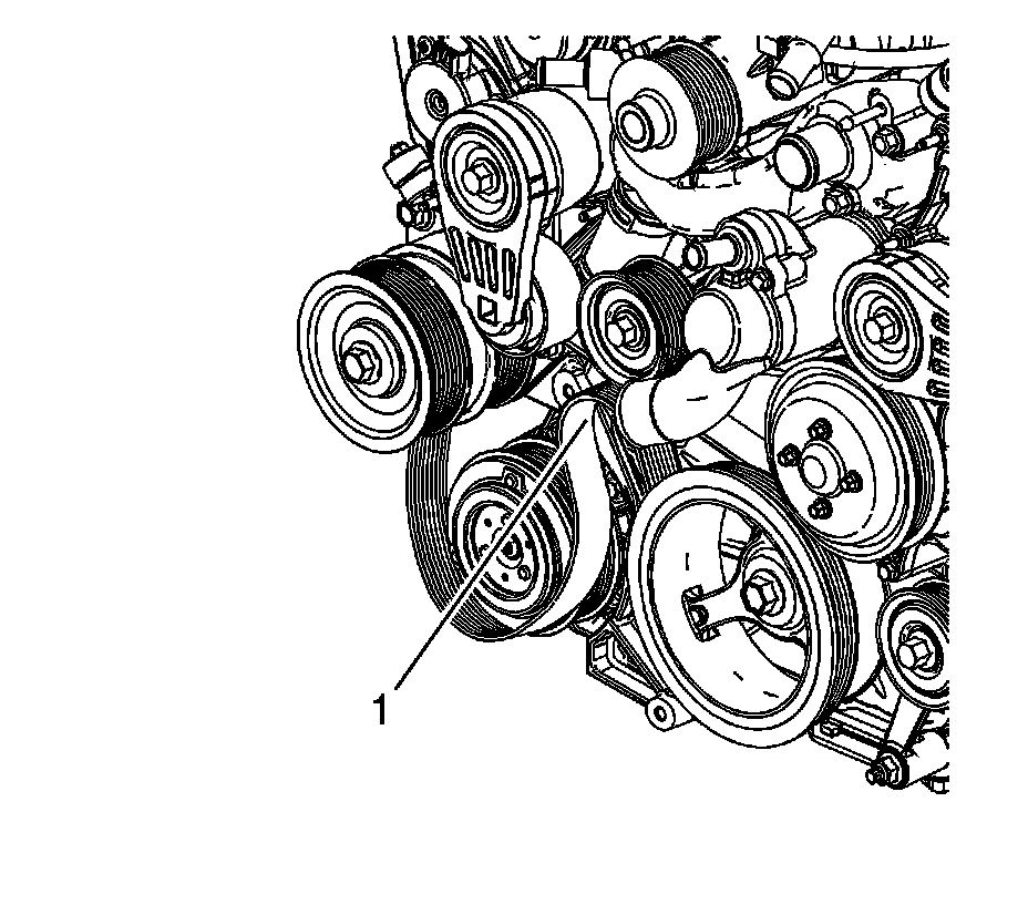 2. Route the A/C compressor and power steering pump drive belt in front of the A/C compressor in order to create access (1) for the installation of the A/C compressor and power steering pump drive belt tensioner.