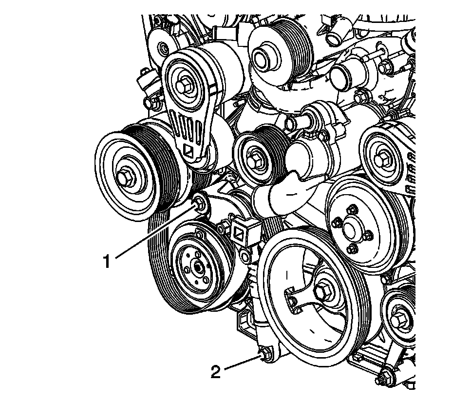 Tighten the A/C compressor and power steering pump drive belt tensioner upper (1) and lower (2) bolts to 25 Nm (18 lb ft).