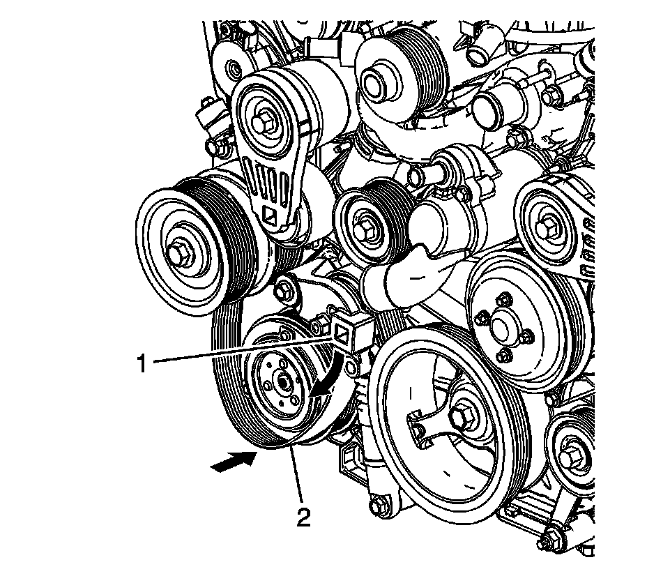 8. Rotate the breaker bar clockwise (1) in order to allow the installation of the A/C compressor and power steering pump drive belt around the A/C compressor (2).