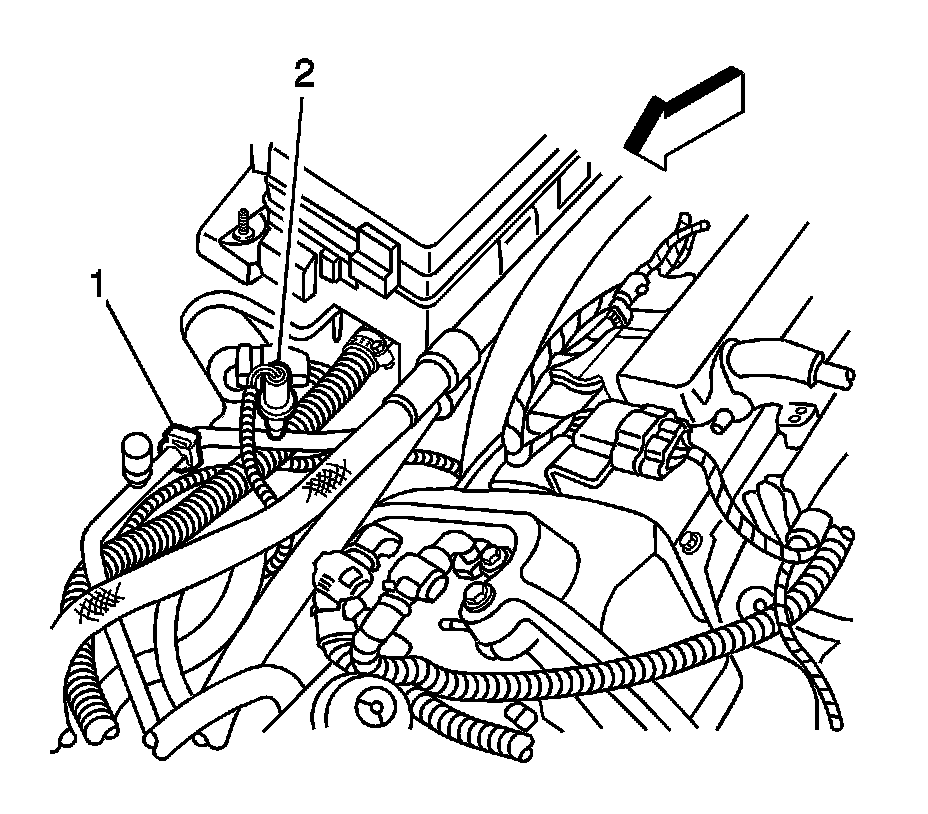 15. Disconnect the surge tank outlet hose and the inlet heater hose from the underhood junction box retainer clip (1).