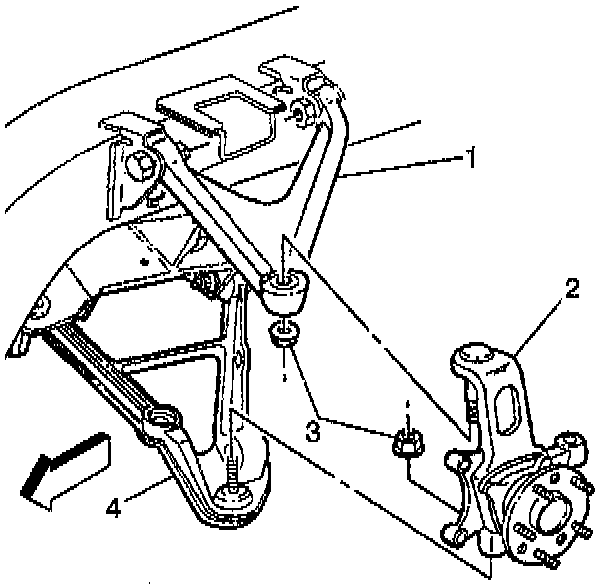 3. Install the suspension knuckle (2) to the lower control arm ball stud. Refer to Rear Axle Lower Control Arm Replacement (Rear Axle Lower Control Arm Replacement).
