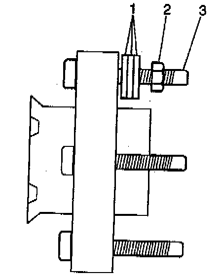 3. With the flat side of a wheel nut (2) against the washers, tighten the wheel nut until the wheel stud head seats against the wheel hub flange.
