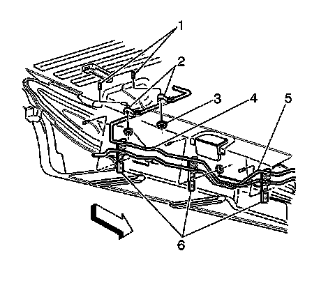1. Install the chassis fuel pipe (5) into the underbody retainers (6).
