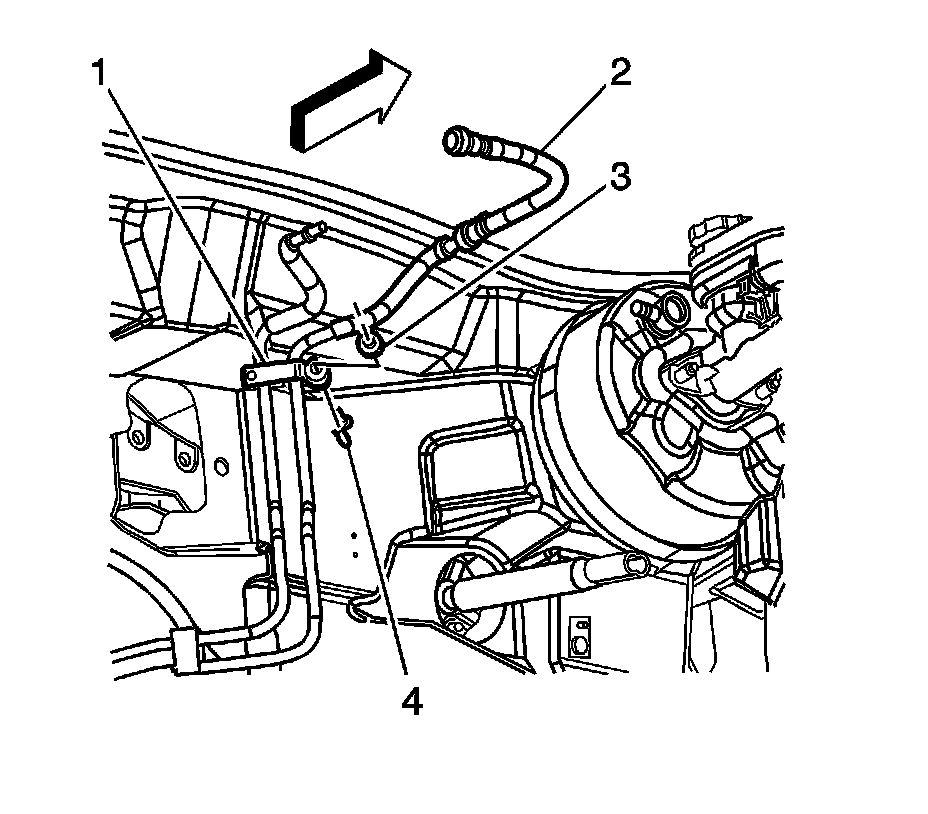 6. Disconnect the chassis fuel and evaporative emission (EVAP) pipe retainer (1) from the upper front of dash mounting stud (3).