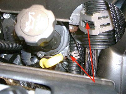 5. Inspect for chafed, damaged, pinched or shorted wiring caused by a mispositioned harness retaining clip as shown. This condition usually occurs when the tab of the clip is aligned with a slot in the conduit.