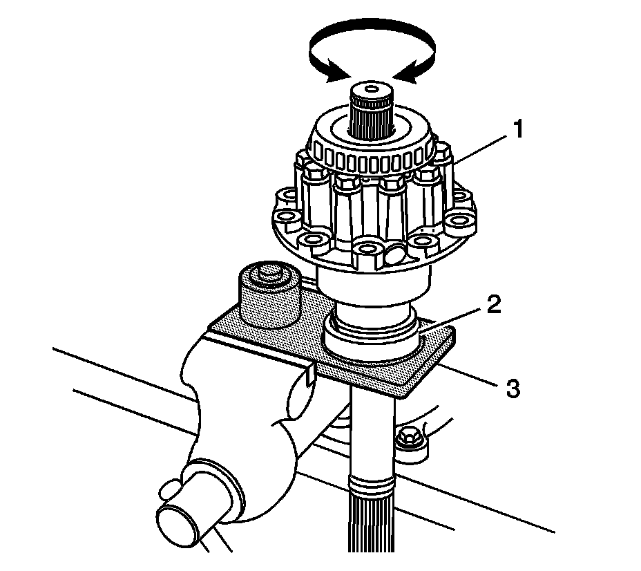 5. Use the J 42155 in order to position the differential case (1) onto the DT-48009-2 (3) and into the bearing cup (2). Rotate the differential, in both directions, in order to seat the bearing to the cup.