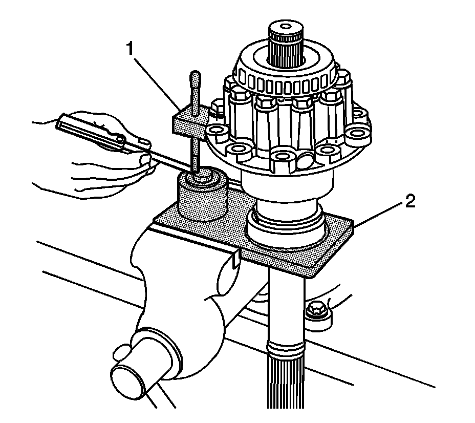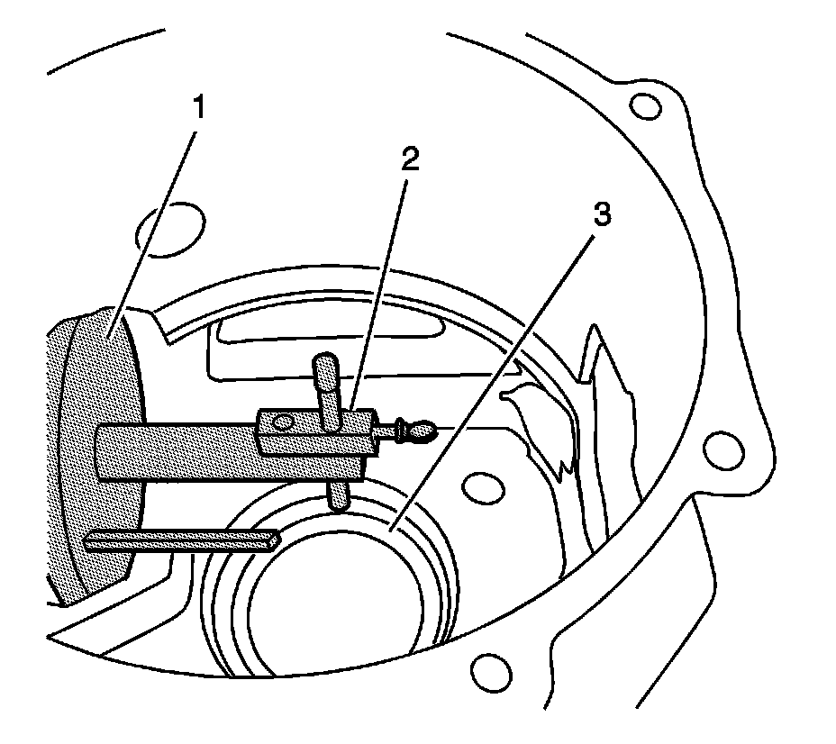 6. Install the DT-48009-3 (2) into the hole in J 42168-2 (1). Loosen the thumbscrew and allow the rod to contact the bottom of the bearing cup bore, machined surface (3).