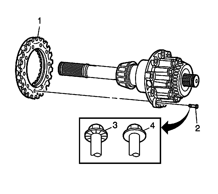 Note: Two types of ring gear bolts may be available for replacement. First design bolts (3) have serrations under the head and are torqued to 195 Nm (144 lb ft). The second design (4) are smooth under the head and are torqued to 145 Nm (107 lb ft).