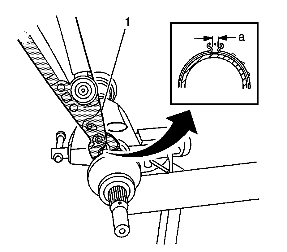 25. Using the J 42572 - pliers (1), close the boot clamp until gap (a) measures 2 and 3 mm (0.079 and 0.118 in), with a difference in the gap width from side to side no greater than 0.4 mm (0.016 in)..