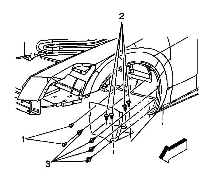 3. Remove the left front lower wheelhouse splash shield fasteners (1, 2, 3) at the rear of the wheelhouse.