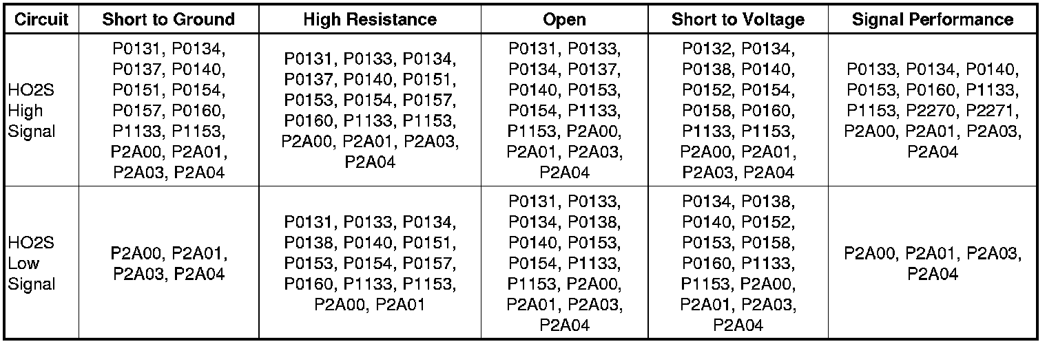 DTC P0133, P0134, P0140, P1133, P2270, P2271, P2A00, or P2A01