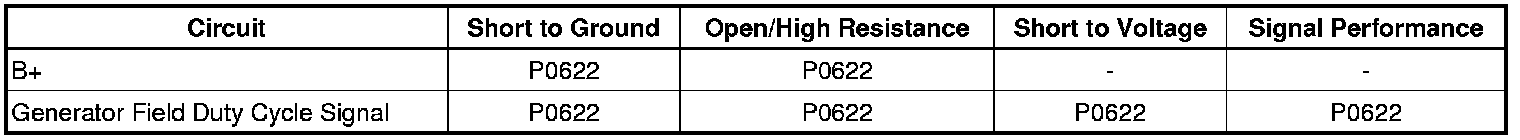 The engine control module (ECM) uses the generator field duty cycle signal circuit to monitor the duty cycle of the generator. The generator field duty cycle signal circuit connects to high side of the field windings in the generator. A pulse width modulated (PWM) high side driver in the voltage regulator turns the field windings ON and OFF. The ECM uses the PWM signal input to determine the generator load on the engine. This allows the ECM to adjust the idle speed to compensate for high electrical loads. The ECM monitors the status of the generator field duty cycle signal circuit. When the ignition is in the RUN position and the engine is OFF, the ECM should detect a duty cycle near 0 percent. However, when the engine is running, the duty cycle should be between 5-95 percent.