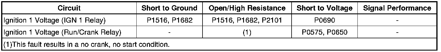 There are 2 ignition 1 voltage circuits supplied to the engine control module (ECM). The first ignition 1 voltage circuit is provided by the IGN 1 relay, through a fuse. This ignition 1 voltage circuit supplies power to all the internal ECM circuits associated with the throttle actuator control (TAC) operation. The run/crank relay provides the second ignition 1 voltage circuit to the ECM, through a fuse. This ignition 1 voltage provides power to other internal ECM circuits, except those associated with TAC operation. The ECM continuously monitors the voltage level difference between the 2 circuits.
