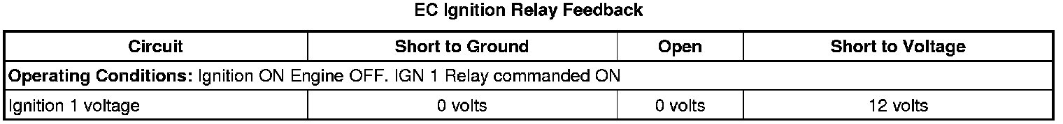 2. Ignition ON, engine OFF, observe the Ignition 1 signal, and the EC Ignition Relay Feedback Signal parameters, on the scan tool. Both parameter values should display no more than 3 volts difference, between the 2 parameters.