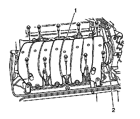 5. Loosely install the 10 bolts attaching the intake manifold (1) to the cylinder heads.