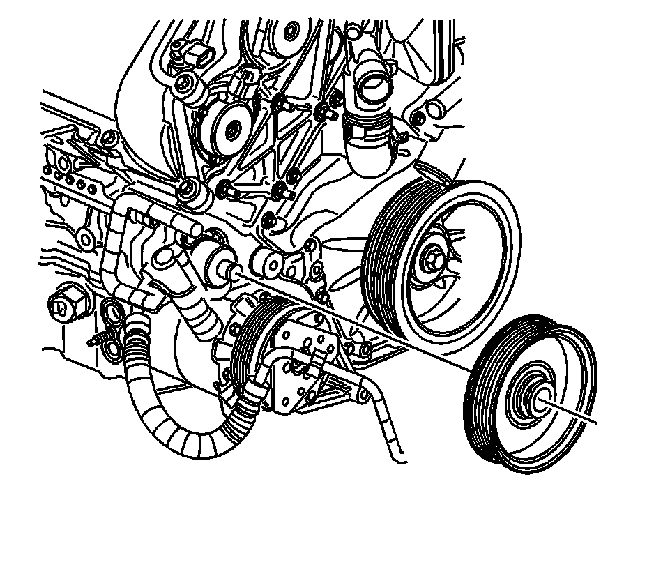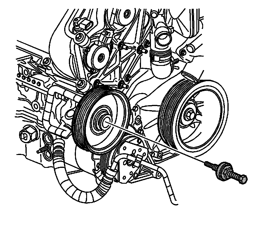 4. Install the J 25033-C into the threads of the power steering pump shaft. Ensure the J 25033-C threads completely into the shaft of the power steering pump before the pressing components of the J 25033-C contact the power steering pulley.