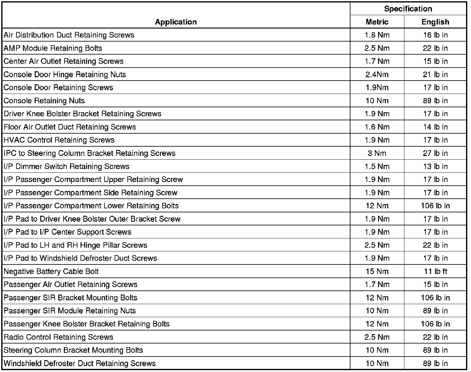 Instrument Panel and Console Trim - Fastener Tightening Specifications