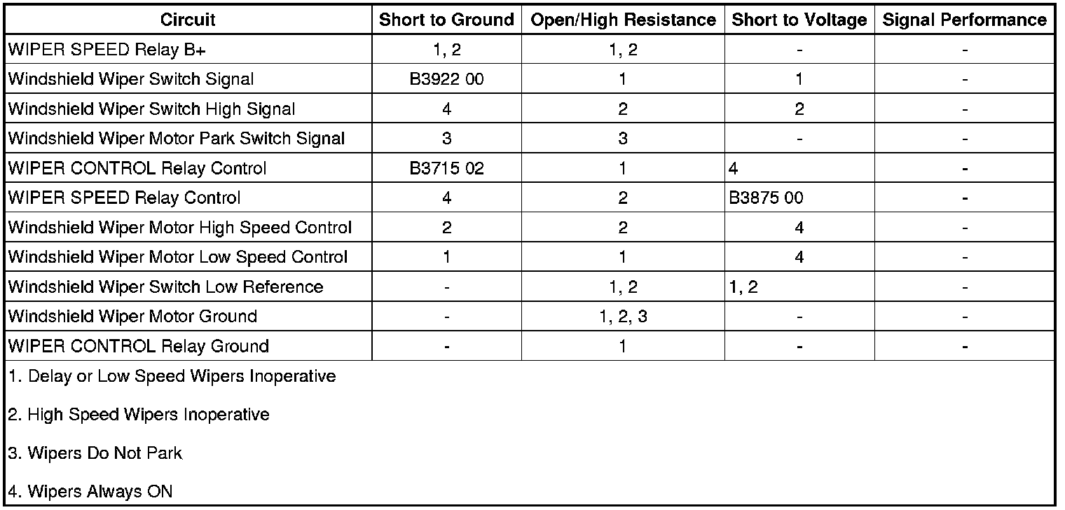 The body control module (BCM) controls the wiper motor based on input from the windshield wiper washer switch. The BCM monitors the wiper washer switch through three separate signal circuits and a ground circuit. The windshield wiper switch high signal circuit is used to determine high speed wiper operation, the windshield wiper switch low signal is used to determine low speed, intermittent, and mist operation through the use of a resistor ladder, and windshield washer switch signal circuit is used to determine washer operation.