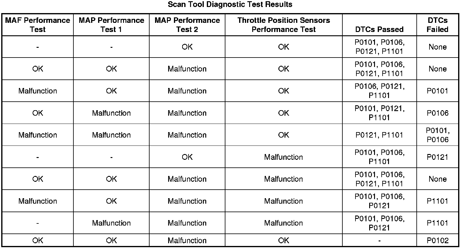 The estimates of MAF and MAP obtained from this system of models and calculations are then compared to the actual measured values from the MAF, MAP, and the throttle position sensors and to each other to determine the appropriate DTC to fail. The following table illustrates the possible failure combinations and the resulting DTC or DTCs.