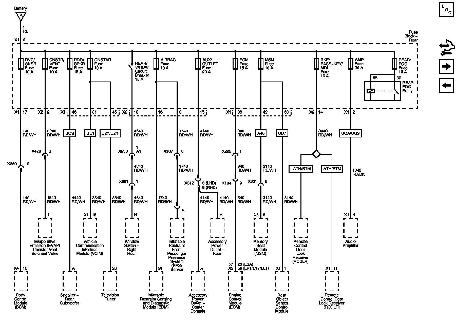 AIRBAG, AMP, AUX OUTLET, CNSTR/VENT, ECM, MSM, ONSTAR, RDO/SPKR, REAR FOG, REAR/WNDW, RKE/PASS-