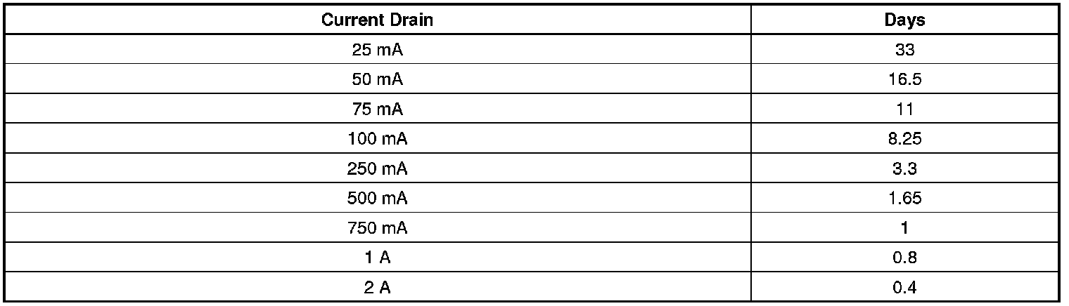 * The battery run down time will vary depending on the batteries reserve capacity. If the reserve capacity is higher, then the battery run down time would be longer. If the reserve capacity is lower, then the battery run down time would be shorter. The graph below indicates roughly how many days a 690 cold cranking amp battery with a 110 min. reserve capacity starting at 80 percent state of charge will last with a constant current draw until it reaches 50 percent state of charge. Differences in battery reserve capacity and temperature will affect the results.