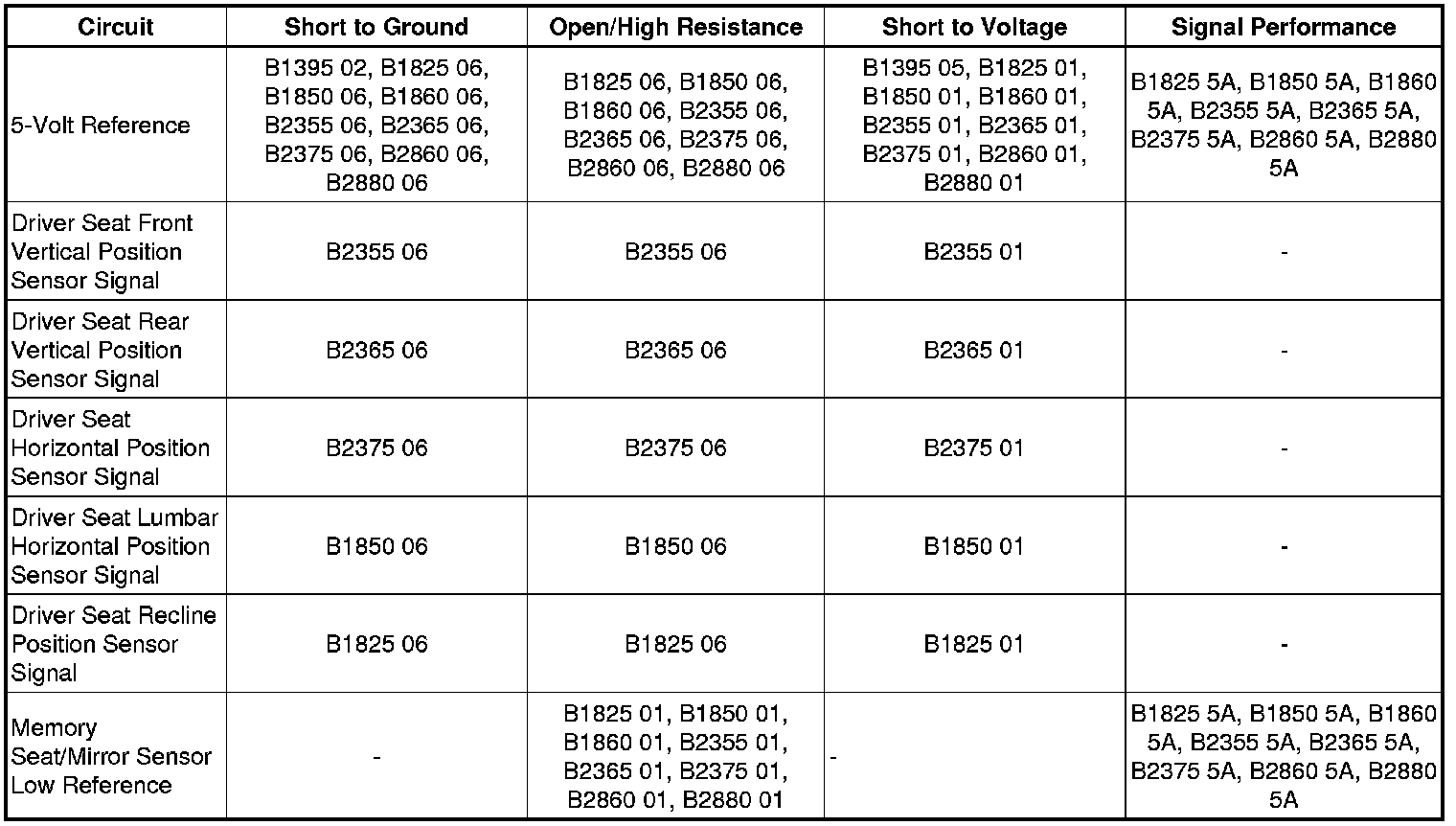The memory seat module (MSM) supplies a 5-volt reference voltage to the driver seat, lumbar, and tilt/telescoping steering column position sensors. The MSM monitors this reference voltage to ensure the accuracy of the voltages being returned from the sensors. If the voltage exceeds the normal operating range, errors will occur in the memory recall operations of the seat and tilt/telescoping steering.